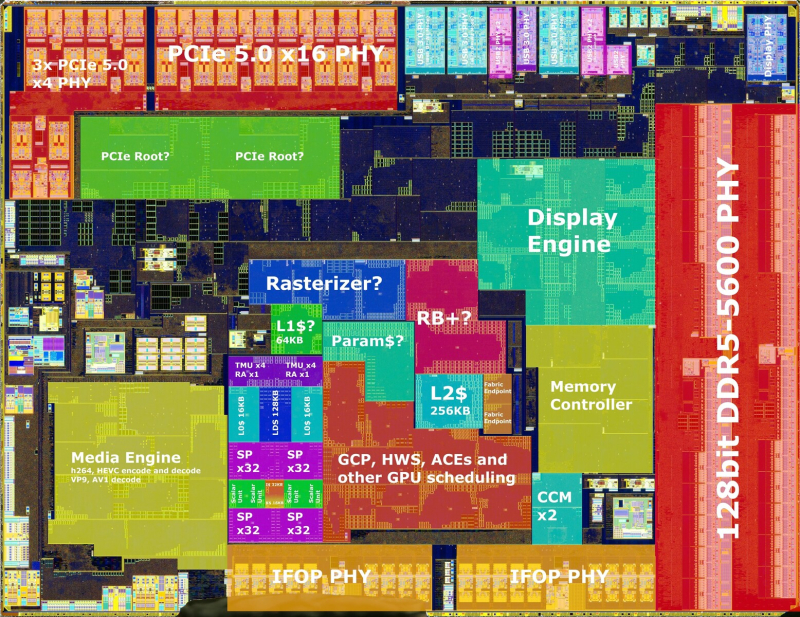 O iGPU, como antes, é baseado na arquitetura gráfica RDNA 2 e está equipado com apenas um grupo de processadores de grupo de trabalho (WGP) com duas unidades de execução (CU) ou 128 processadores de fluxo. Outros componentes importantes do cIOD são a interface PCIe Gen 5 com suporte para 28 pistas, duas interfaces IFoP para interconexão com blocos principais CCD, uma E/S SoC bastante grande com suporte para USB 3.x e outros tipos de interfaces, também como uma das partes mais importantes do processador – controlador de memória DDR5 com interface de canal duplo (com quatro subcanais).