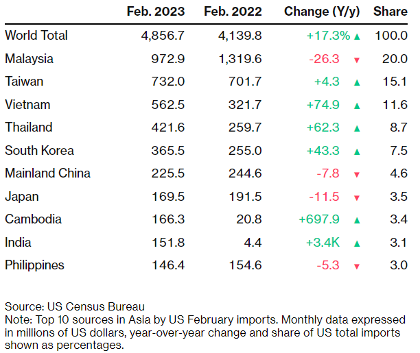 A rigor, no final de fevereiro, o volume de importações de produtos semicondutores nos Estados Unidos em relação ao mesmo mês de 2022 aumentou em valor 17%, para US$ 4,86 ​​bilhões.Os países asiáticos representaram 83% das principais importações em fevereiro. A Índia apresentou, de forma geral, um aumento de 34 vezes na oferta, embora em termos absolutos tenha ficado distante (3,1%) do líder, que continua sendo a Malásia. A participação desse país responde por 20% de todas as importações de chips dos Estados Unidos, mas em fevereiro deste ano as entregas nesse sentido caíram 26,3%. Taiwan ocupa o segundo lugar com 15,1%, mas os embarques dessa ilha cresceram apenas 4,3% em fevereiro.