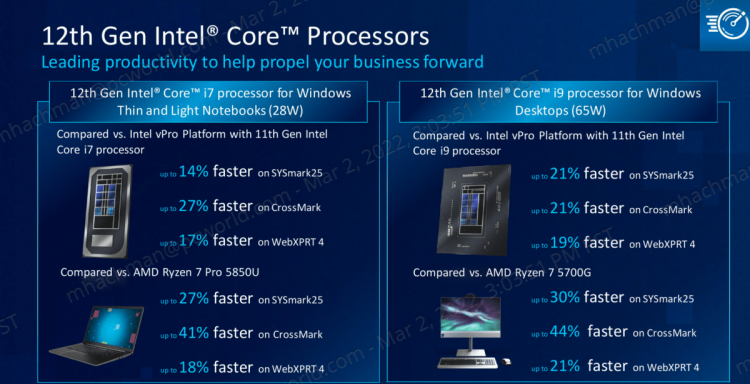 A empresa não se esqueceu da velocidade dos novos processadores. O fabricante afirma que os chips Alder Lake vPro para dispositivos móveis e desktop oferecem desempenho superior aos concorrentes e antecessores. Por exemplo, o Core i7-1280P móvel reivindica desempenho 27% melhor (teste CrossMark) do que seu antecessor de 11ª geração e desempenho 41% melhor do que o Ryzen 7 PRO 5850U móvel.