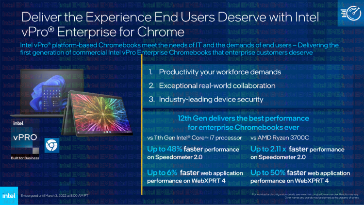 - Intel vPro Enterprise for Chrome – uma plataforma para quem usa uma grande frota de laptops ou outros dispositivos baseados no Chrome OS nos negócios, tem todas as vantagens da versão Windows.