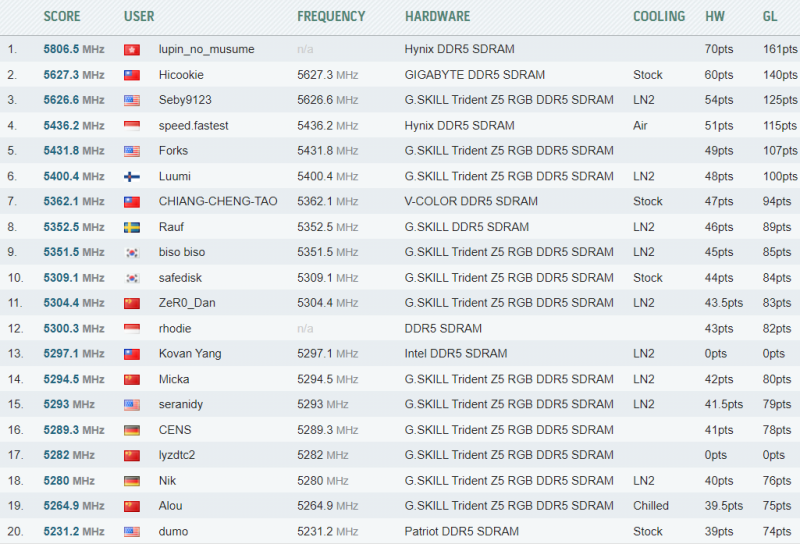 Além do overclock da CPU, a ASUS também apresenta novos recordes de desempenho em suas placas-mãe no SUPERPI 32M do overclocker japonês Freyama, no Cinebench R20 da OGS da Grécia, bem como um recorde de overclocking de RAM DDR5 de 11.614 MT/s do overclocker de Hong Kong. lupin_no_musume.