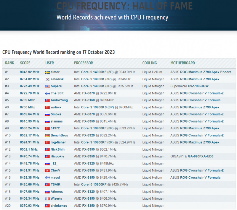 O overclocker interno da ASUS, Jon “Elmor” Sandström, fez overclock do principal processador Intel Core i9-14900K da série Raptor Lake Refresh para uma frequência de 9,1 GHz. Este é um novo recorde absoluto para overclock de CPU em frequência.