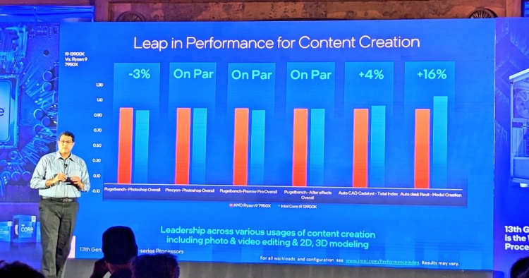 Em outro slide mostrado, a Intel mostrou o desempenho do Core i9-13900K em diversas aplicações. PugetBench, Procyon, AutoCAD/AutoDesk foram escolhidos para os testes. Segundo a Intel, em metade dos testes entre os dois carros-chefe, há paridade no desempenho. No Photoshop, o novo Intel é 3% mais lento que o processador AMD, e nos programas de design AutoDesk / AutoCAD, pelo contrário, é 4% e 16% mais rápido.