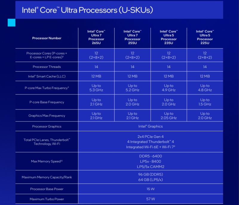 No total, a Intel lançou quatro modelos Core Ultra 200U, e cada um deles possui 12 núcleos – dois núcleos P, oito núcleos E e dois núcleos LP-E de baixo consumo de energia. Os processadores diferem em frequências: o Core Ultra 7 265U mais antigo acelera para 5,3 GHz, enquanto o Core Ultra 5 225U mais jovem pode ostentar apenas 4,9 GHz. Os valores base e máximo de TDP são definidos em 15 W e 57 W, respectivamente.