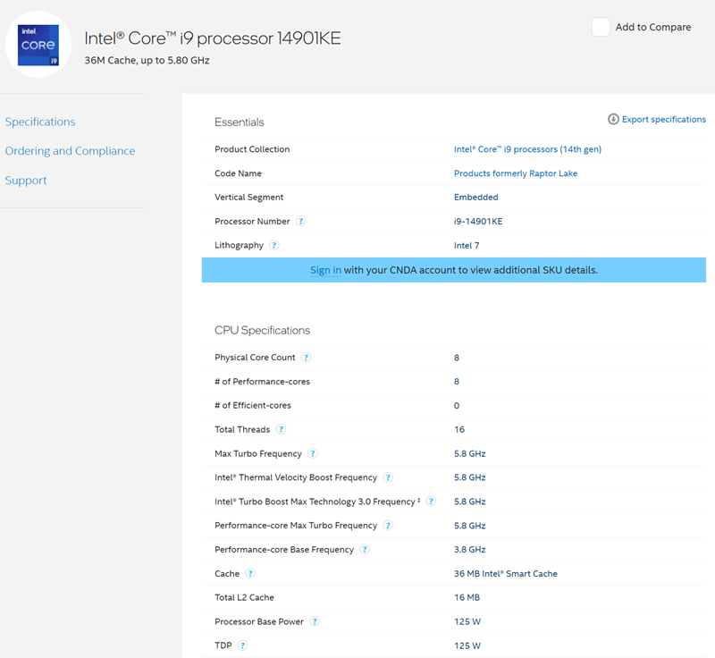 Segundo o recurso Wccftech, o carro-chefe da nova linha é o Core i9-14901KE. Possui 8 núcleos e 16 threads, velocidade de clock base de 3,8 GHz e frequência turbo máxima de 5,8 GHz. A memória cache é de 36 MB L3 e 16 MB L2. O TDP/PL1 declarado é de 125 W. Curiosamente, este processador suporta overclock, o que não é típico de sistemas embarcados.