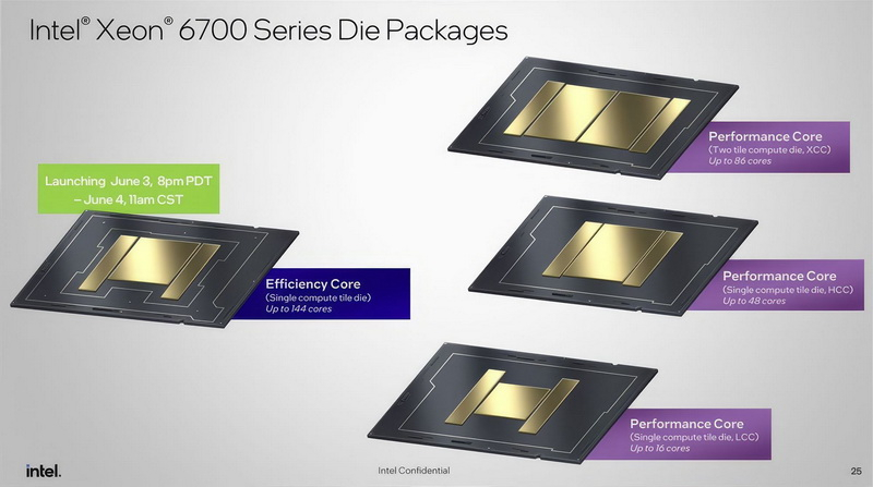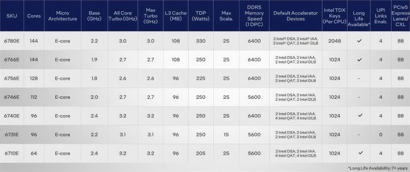 A série Xeon 6700E de processadores para servidores com eficiência energética inclui sete chips com um número de E-cores de 64 a 144, oferecendo frequências básicas de 1,8 a 2,4 GHz e frequências Turbo de 2,6 a 3,2 GHz. O consumo de energia declarado dos processadores varia de 205 a 330 W.