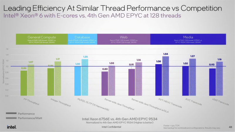 A Intel afirma que o Xeon 6756E de 128 núcleos oferece até 1,34 vezes mais eficiência de energia em comparação com o AMD EPYC 9534 de 64 núcleos e 128 threads, ao mesmo tempo que oferece praticamente o mesmo desempenho em uma variedade de cenários.