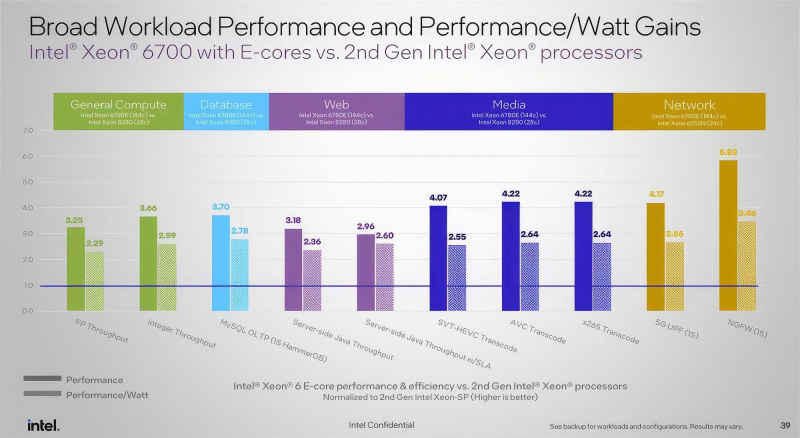 Comparando um sistema com dois Xeon 6756E de 128 núcleos contra dois Xeon Platinum 8592+ de 64 núcleos (Xeon de 5ª geração), a empresa observa superioridade de desempenho do Xeon 6 de até 1,55 vezes em cargas de trabalho de uso geral, até 1,63 vezes em cargas de trabalho com bancos de dados , até 1,49 vezes ao trabalhar com a Web, até 1,52 vezes ao trabalhar com mídia e até 1,66 vezes ao trabalhar com a rede.