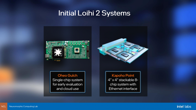 O primeiro dispositivo baseado em Loihi II foi o cartão de chip único Oheo Gulch para desenvolvimento e depuração de software. Atualmente, está disponível apenas para parceiros selecionados da Intel na Neuromorphic Research Cloud. O próximo dispositivo será a placa Kapoho Point compacta (4 “× 4”), que já carrega oito chips Loihi II a bordo e fornece Ethernet e GPIO, além de várias interfaces para sensores e atuadores. As placas podem ser conectadas diretamente umas às outras para facilitar a expansão do poder de computação. No futuro, será possível integrar chips em SoCs híbridos para diversas tarefas, bem como o surgimento de soluções para data centers.