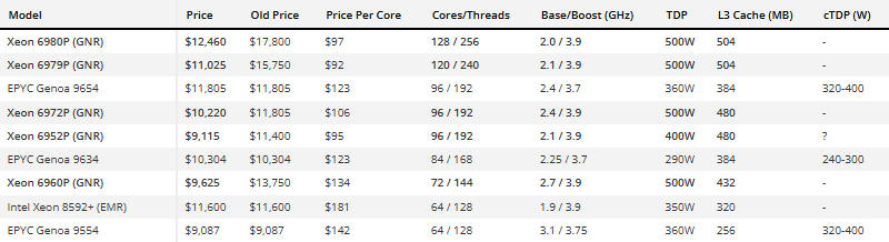Como resultado, o Intel Xeon 6980p de 128 núcleos (US $ 12.460), embora permaneça mais caro que o mais velho na linha AMD Epyc Genoa 9654 (US $ 11.805), mas ofereceu um preço mais favorável para o núcleo-US $ 97 para o primeiro e US $ 123 no segundo; Os concorrentes diretos de 96 núcleos da Intel se tornaram mais baratos que os análogos da AMD e em termos absolutos. Ao mesmo tempo, 64 processadores de núcleos da AMD permaneceram mais baratos que os concorrentes da Intel, porque nesse segmento preços “azuis” não foram reduzidos.
