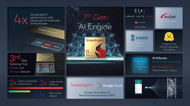 O produto inclui o Qualcomm AI Engine de sétima geração. É possível usar câmeras com resolução de até 200 milhões de pixels ou três câmeras de 36 megapixels ao mesmo tempo. Implementação da tecnologia de carregamento rápido Qualcomm Quick Charge 5.