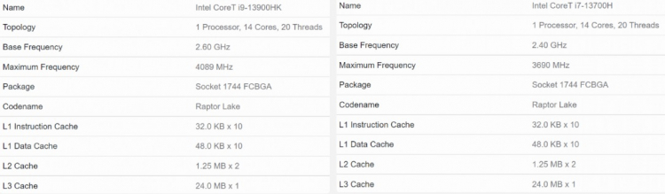 O banco de dados de teste sintético Geekbench tem os resultados dos testes dos processadores móveis Core i9-13900HK e Core i7-13700H. De acordo com o teste, ambos os chips são de 14 núcleos (seis núcleos poderosos e oito núcleos eficientes em termos de energia) e suportam 20 threads virtuais. Os chips foram testados em alguns laptops da Samsung.