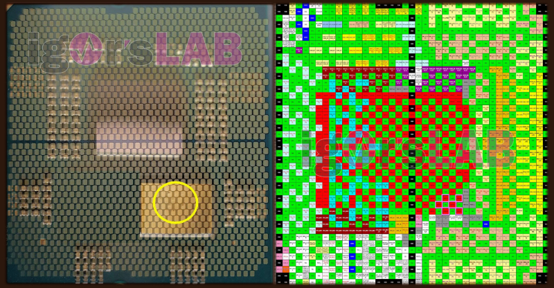 «[Processadores Ryzen 7000 e Ryzen 7000X3D] diagrama de bloco que montei, mostrando os locais de dano. A AMD forneceu apenas quatro quadrados separados [com pads], sem sequer dimensionar as imagens para um único tamanho. No entanto, deve-se levar em consideração que os contatos no processador real (foto à esquerda) são deslocados da linha central, enquanto no diagrama de pinos (na imagem à direita) eles são escalonados. Se levarmos em conta esse deslocamento de contatos na foto do processador real e correlacionarmos com o local dos contatos no diagrama (destacado em roxo), fica óbvio que esses contatos estão associados ao VDDCR (CPU Core Power Supply) função, que é responsável por alimentar o processador ”, escreve Vallosek.