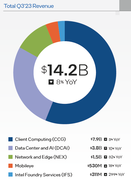 A direção de componentes de rede e computação periférica (NEX) na comparação anual mostrou uma diminuição na receita em 32%, para US$ 1,5 bilhão, o lucro operacional caiu 91%. O mercado ainda sofre com a baixa demanda e com a preservação do aumento dos estoques de produtos. A subsidiária Mobileye registrou um crescimento de receita de 18% em relação ao ano anterior, para US$ 530 milhões no terceiro trimestre, à medida que a demanda por sua família de chips EyeQ usados em sistemas de assistência ao motorista cresceu. O lucro operacional da divisão aumentou 20%, para US$ 170 milhões, mas as perspectivas futuras para a divisão israelense da Intel são obscurecidas pelo conflito militar em curso na região. As atividades da empresa Intel em Israel não foram afetadas pelos acontecimentos recentes na região.