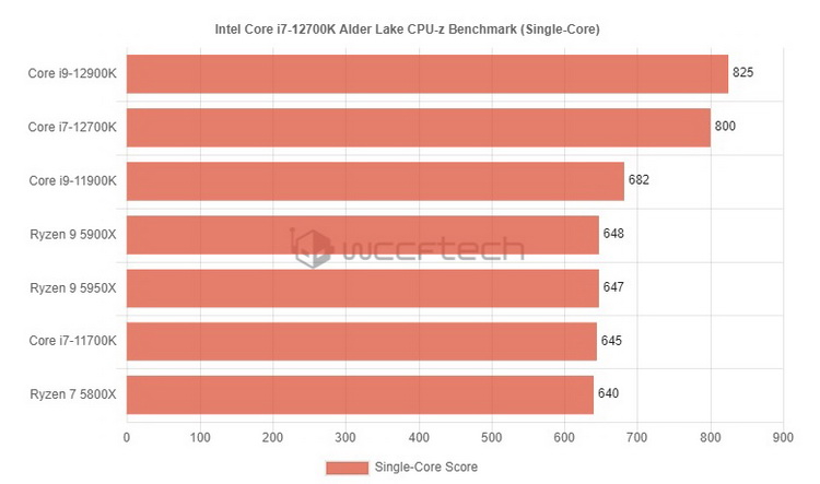 Os resultados de teste disponíveis do Core i7-12700K em CPU-Z indicam que em um teste de thread único é 17,3% mais rápido do que o atual carro-chefe Intel Core i9-11900K, enquanto os processadores Core i7-11700K e AMD Ryzen 7 5800X são 24% mais rápido.