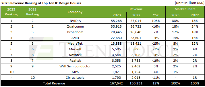 A Qualcomm caiu para o segundo lugar devido a uma queda na receita de 16%, para 30,9 bilhões. A propósito, a Nvidia, que ficou em primeiro lugar no final do ano passado, aumentou sua participação de mercado em termos monetários entre os maiores desenvolvedores de chips de 18 para 18. 33%, portanto a sua participação é previsível na dinâmica geral da receita. A Mediatek, embora tenha mantido a quinta posição, reduziu as receitas em 25%, para 13,9 mil milhões de dólares, e perdeu quatro pontos percentuais de posição de mercado para os seus concorrentes, contentando-se com 8% do mercado. A Realtek, devido a uma perda de 19% de receitas face a 2022, caiu do 7.º para o 8.º lugar, mas em termos monetários a sua quota de mercado manteve-se igual a 2%.