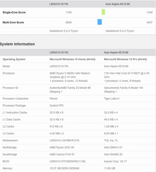 O resultado da medição do desempenho do modelo Intel Core i5-1135G7 no laptop Acer também foi publicado na web. Este chip básico também possui quatro núcleos físicos e oito threads virtuais. A quantidade de memória cache do 2º nível é semelhante à do carro-chefe (1,25 MB por núcleo, o que dá um total de 5 MB), mas o modelo mais jovem tem uma quantidade menor de memória cache do 3º nível – apenas 8 MB.