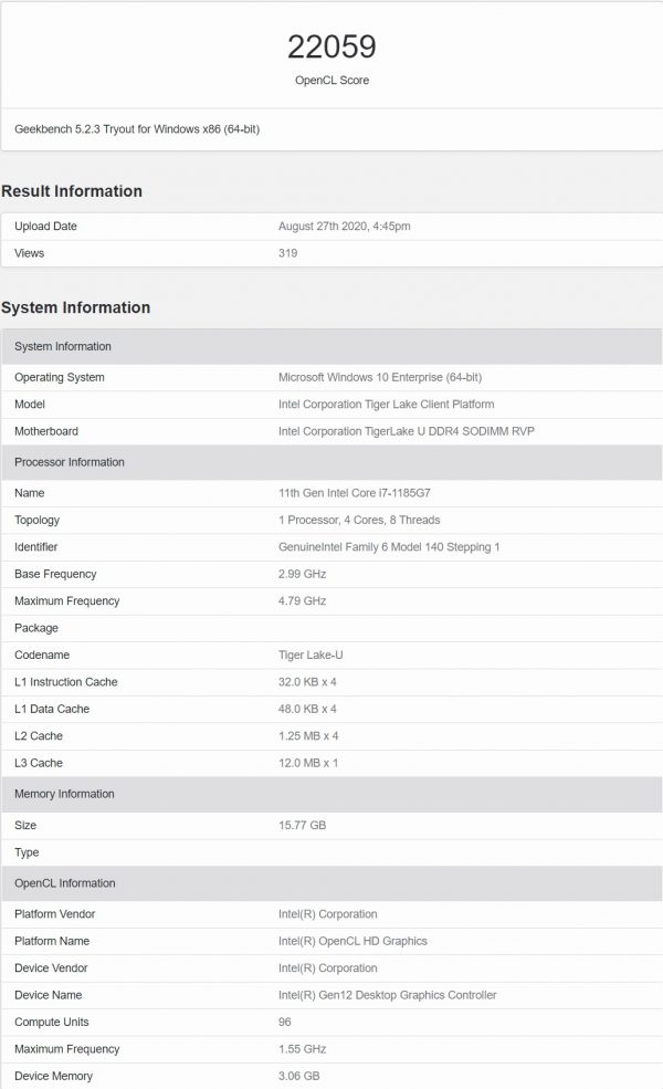 Os resultados dos testes de desempenho computacional do processador Intel Core i7-1185G7 foram encontrados no banco de dados Geekbench 5 pelo notório usuário TUM_APISAK. De acordo com as informações registradas no banco de dados, a frequência nominal do processador é 3,0 GHz. No modo de overclock automático, pode ir até 4,8 GHz. Portanto, a frequência base e máxima do chip principal é cerca de 2 e 7% mais alta do que os valores mostrados pelo modelo Intel Core i7-1165G7 pré-principal. Em comparação com o Core i7-1065G7, construído no design Ice Lake usando a tecnologia de processo anterior de 10 nm, a frequência base do Core i7-1165G7 é 2,3 vezes maior e a frequência máxima aumentou 23%. O novo chip tem um TDP nominal de 15 W. O nível de potência máxima PL1 (nível de potência 1) chega a 28 W.