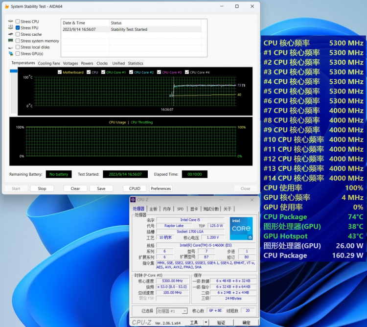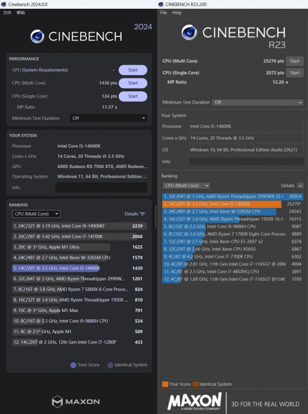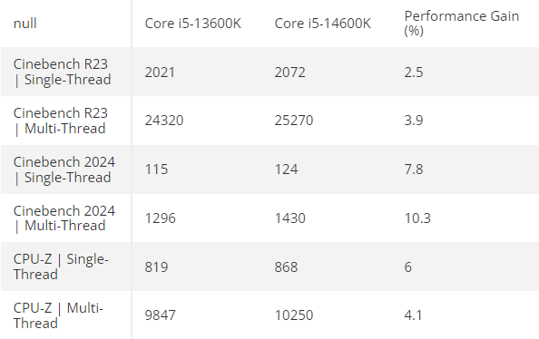 O processador foi testado nos benchmarks Cinebench R23, Cinebench 2024 e CPU-Z. Dependendo do teste, o Core i5-14600K acabou sendo de 2,5 a 10,3% mais rápido que seu antecessor. O consumo de energia do novo chip nos testes foi de 160 W, enquanto o Core i5-13600K, segundo nossos testes, consome menos de 160 W durante a renderização.