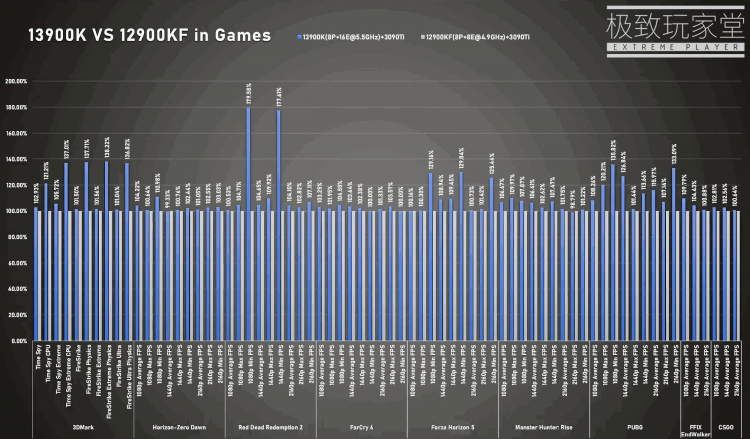 Intel Core i9-13900K e Core i9-12900KF em jogos. Fonte: ExtremePlayer (Bilibili)