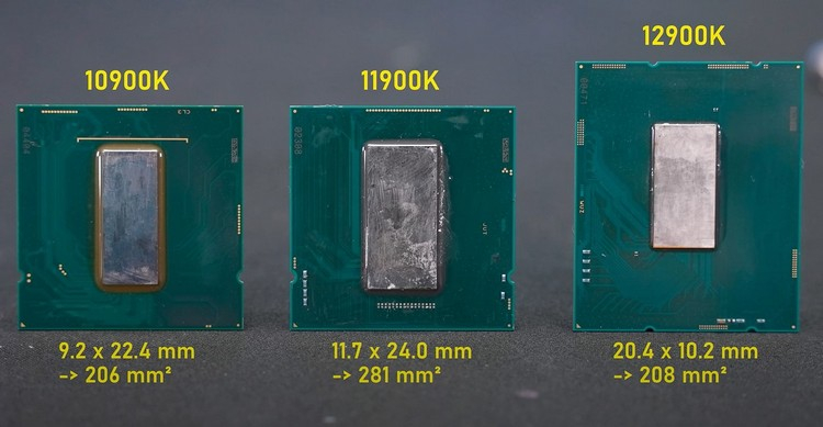 Como você pode ver na foto acima, o cristal do Core i9-12900K de 16 núcleos (8 + 8 núcleos) tem uma área menor do que o cristal de seu antecessor, o Core i9-11900K de oito núcleos, mas ao mesmo vez é ligeiramente maior do que o Core i9-10900K de 10 núcleos. As dimensões do cristal da novidade são 20,4 × 10,2 mm, o que dá uma área de 208 mm2. Por sua vez, o chip Core i9-11900K tem uma área de 281 mm2, ou seja, é cerca de 26% maior, mas o cristal do Core i9-10900K é quase o mesmo – 206 mm2.