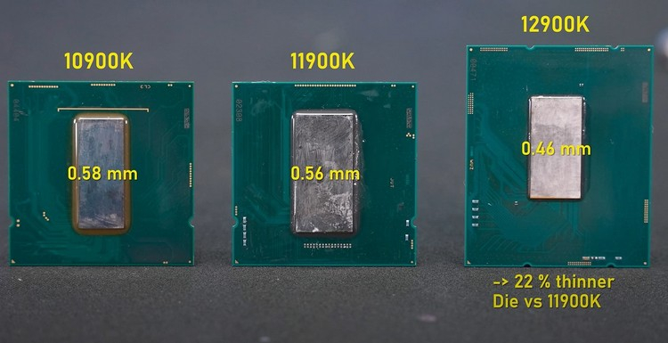 As dimensões compactas do Core i9-12900K são devido à transição para a nova tecnologia de processo Intel 7 mais fina, que é um tipo de tecnologia de 10 nm. Os chips das gerações anteriores são feitos de acordo com a tecnologia de processo de 14 nm. A propósito, de acordo com Hartung, o cristal Core i9-12900K é 22% mais fino do que o cristal Core i9-11900K.