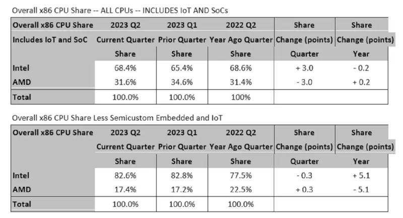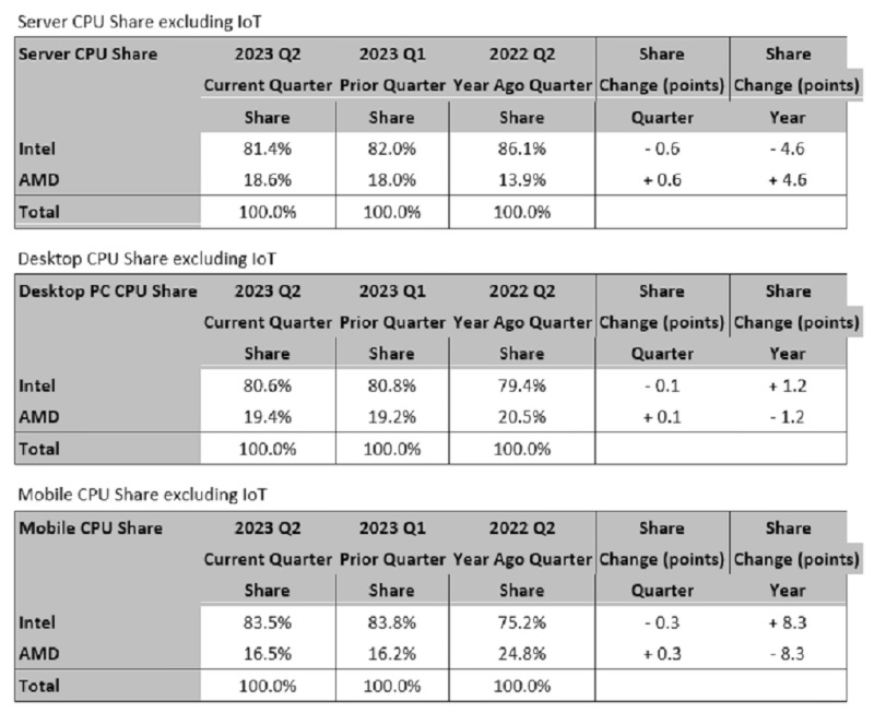 Na corrida de curto prazo entre AMD e Intel, a última saiu vitoriosa, com o campo azul ganhando 5,1 pontos percentuais ano a ano em participação de mercado, excluindo IoT e SOCs incorporados (que incluem chips de console da AMD). No mercado de processadores para desktop, a Intel ganhou 1,2 p.p., e no segmento móvel – 8,1 p.p. Infelizmente, disse o analista-chefe da Mercury, Dean McCarron, os dados fornecidos são bastante probabilísticos por natureza: ajustes são possíveis à medida que as redes de varejo e outros fornecedores nas cadeias voltam à vida. Números precisos podem ter que esperar até o final de 2023.