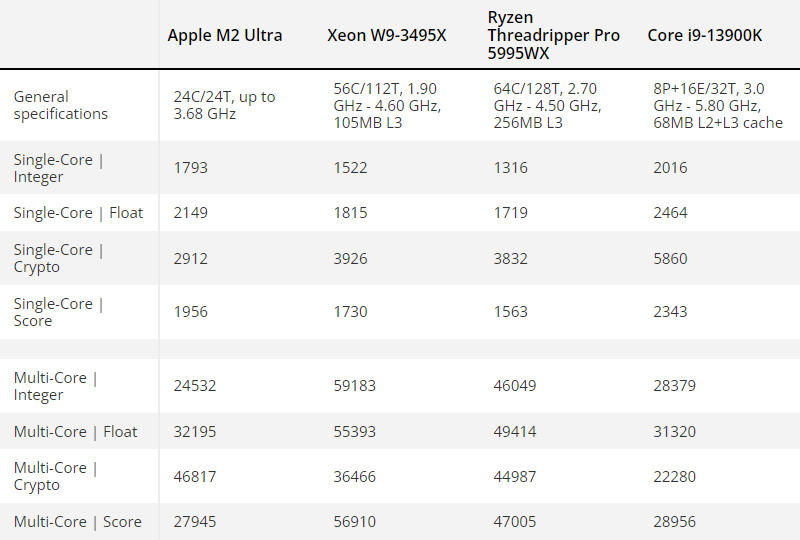O Apple M2 Ultra é um poderoso processador com 24 núcleos de uso geral e 76 núcleos gráficos integrados. Provavelmente é mais rápido que o Intel Xeon W de 28 núcleos encontrado no Mac Pro 2019, e os proprietários das novas estações de trabalho da Apple verão um aumento notável no desempenho. Mas nos testes do Geekbench 5, ele não conseguiu vencer os atuais concorrentes da AMD e da Intel – eles têm muitos núcleos e a velocidade do clock é muito alta.