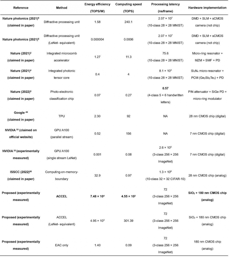 O processamento de imagem ACCEL não requer um ADC para converter a imagem, usando diretamente fotocorrentes induzidas pela luz para cálculos, resultando em latência significativamente reduzida. ACCEL atinge uma eficiência energética do sistema de 74,8 peta-ops por watt, mais de três ordens de magnitude superior às GPUs atuais. As velocidades de computação atingem 4,6 operações peta por segundo, com mais de 99% dos cálculos realizados opticamente.