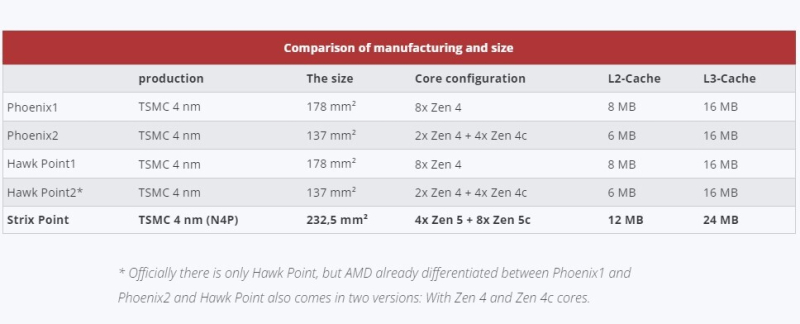 O aumento da área do cristal Strix Point é explicado pelo aumento do número de unidades de execução dos gráficos Radeon 800M integrados na nova arquitetura RDNA 3.5 de 8 para 12 para o modelo Ryzen AI 9 365 e de 12 para 16 para o Ryzen AI 9 HX 370. Além disso, a área do novo cristal tornou-se maior devido ao cache L3 aumentado para 24 MB e em geral devido aos núcleos Zen 5 e Zen 5c maiores.