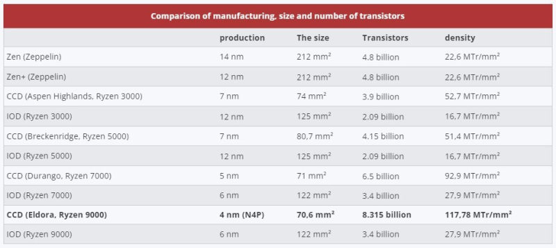 Assim, o número total de transistores no principal processador Ryzen 9 9950X de 16 núcleos com dois chips CCD é de 20,03 bilhões. Por sua vez, o Ryzen 7 9700X com um CCD contém 11,715 bilhões de transistores.