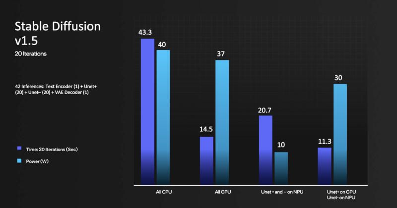A Intel demonstrou as capacidades do Meteor Lake em trabalhar com algoritmos de IA usando o exemplo do gerador de imagem Stable Diffusion. O processador gráfico integrado completou a tarefa de benchmark em 14,5 segundos, demonstrando um consumo de 37 W. A NPU processou a mesma tarefa um pouco mais – 20,7 s, mas exigiu apenas 10 W de potência. Também é possível combinar recursos – juntos, GPU e NPU completaram a tarefa em 11,3 s, e a potência foi menor que no primeiro caso – 30 W.