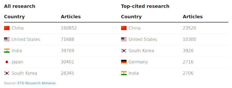 A China está rapidamente fortalecendo sua posição no design e na produção de chips de última geração, superando os Estados Unidos tanto no número de publicações científicas quanto em sua importância. De acordo com a Universidade de Georgetown (GU), entre 2018 e 2023, pesquisadores chineses publicaram mais que o dobro de artigos científicos que seus colegas americanos. Essa pesquisa fundamental ameaça a eficácia dos controles de exportação dos EUA, o que pode levar à perda de sua posição dominante no desenvolvimento de microchips avançados.