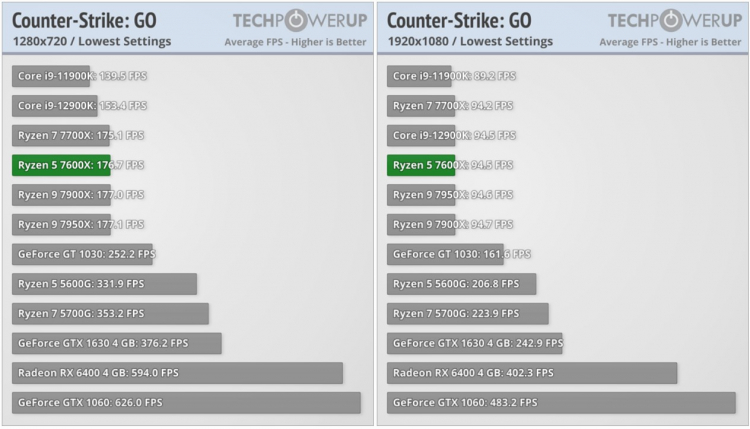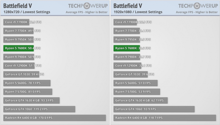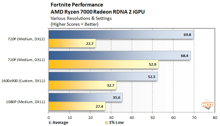 Fortnite também não foi poupado. Ele foi executado em 1080p em configurações de qualidade de imagem média usando DirectX 11. Sob essas condições, o jogo teve uma média de 30 quadros por segundo. Reduzir a resolução para 1600 × 900 pixels elevou o contador médio de FPS para 50 e, ao diminuir ainda mais as configurações, o jogo conseguiu obter mais de 60 quadros por segundo do jogo. Apesar disso, os jornalistas não recomendaram os gráficos integrados dos chips Ryzen 7000 como uma solução de jogo permanente.