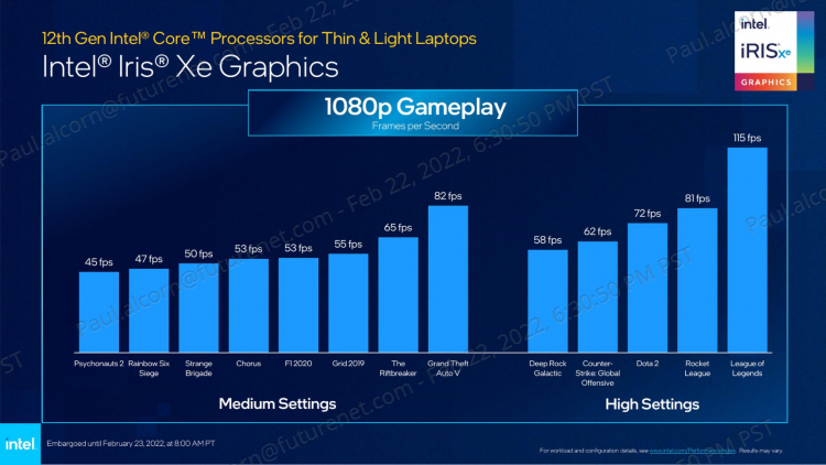 Como os processadores da série Alder Lake P e U usam a mesma GPU integrada que os chips Tiger Lake, não devemos esperar mudanças significativas de desempenho aqui. No entanto, a empresa forneceu dados de desempenho para os gráficos integrados dos novos chips em alguns jogos em 1080p usando configurações de imagem médias a altas.