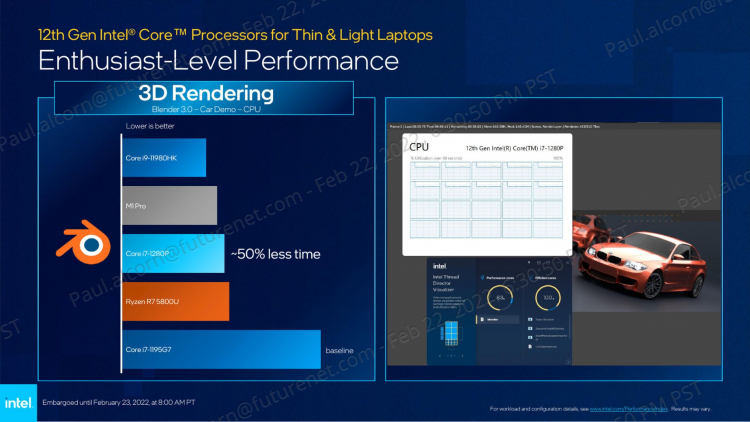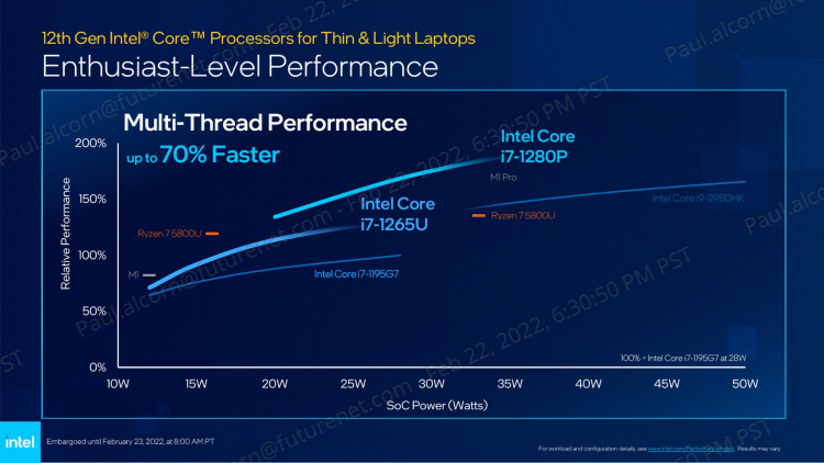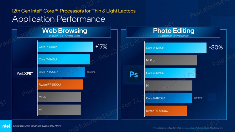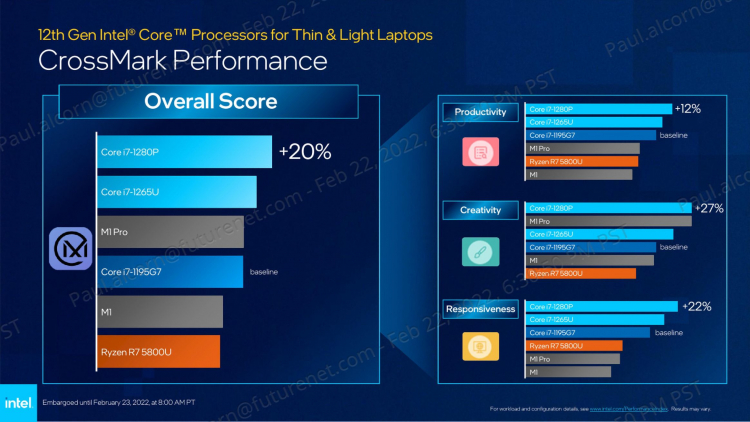 Os processadores da série Alder Lake P são até 70% mais rápidos em desempenho multi-thread do que o Core i7-1195G7 da Tiger Lake, classificado em 28W, de acordo com a Intel. Por sua vez, os modelos da série Alder Lake U são até 30% mais rápidos do que a geração anterior. Deve-se notar que a Intel reivindica uma superioridade de 70% dos chips de nova geração sobre seus próprios processadores da geração anterior, e não sobre as soluções AMD e Apple. Blender, WebXPRT 4 (teste de navegador), PugetBench for Photoshop e o benchmark CrossMark, que é um teste abrangente de todo o sistema em determinadas tarefas, também foram usados ​​para testar o desempenho single-thread e multi-thread dos novos chips.