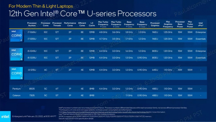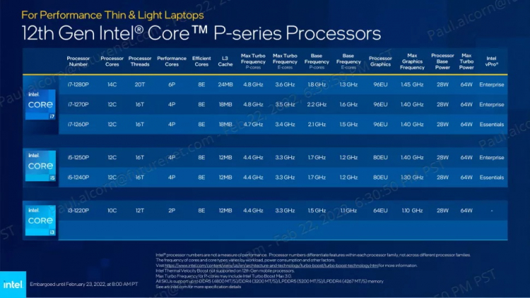 Ao contrário dos celulares da série Alder Lake H de alto desempenho do mês passado com um TDP nominal de 45W, ambas as séries acima de chips Core de 12ª geração com eficiência energética destinam-se ao uso em laptops finos e leves.