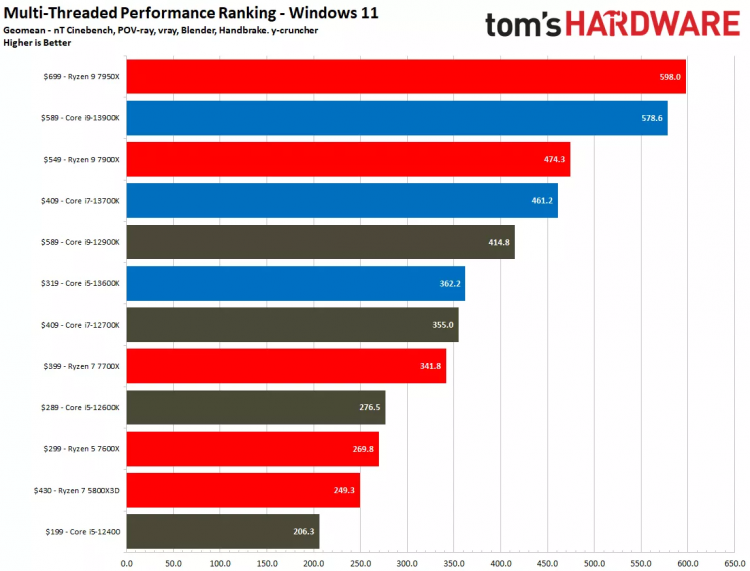 Mas, ao mesmo tempo, em aplicativos de criação de conteúdo multithread, o desempenho do Core i9-13900K e do Ryzen 9 7950X é praticamente o mesmo.
