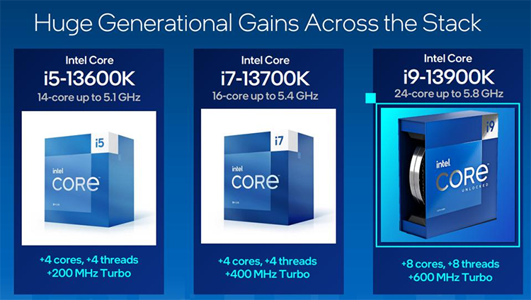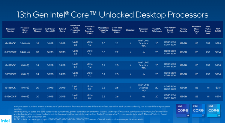A família Raptor Lake difere da família Alder Lake em um número maior de E-cores energeticamente eficientes, velocidades de clock maiores e caches L2 e L3 maiores. Em particular, o Core i9-13900K oferece 8 P- e 16 E-cores, frequências de 3,0-5,8 GHz, 36 MB de cache L3, MTP 253 W e tem um preço de US$ 589. O modelo médio Core i7-13700K tem 8 núcleos P e E, frequências de 3,4-5,4 GHz, cache L3 de 30 MB, MTP 253 W e um preço de US$ 409. E as características do Core i5-13600K mais jovem são assim: 6P + 8E, 3,5-5,1 GHz, 24 MB L3, MTP 181 W e US$ 319.