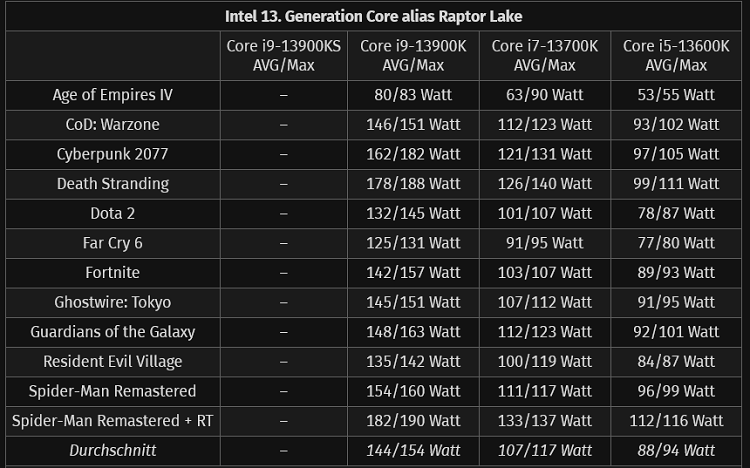 Ao mesmo tempo, quase todas as análises observam que o Raptor Lake é caracterizado por consumo significativo e altas temperaturas, mesmo ao usar sistemas de refrigeração muito poderosos. Por exemplo, em cargas de trabalho multithread, pode consumir até 275 watts e em testes de estresse com AVX2, até 320 watts. No entanto, os jogadores provavelmente não encontrarão esse consumo – o consumo médio do Core i9-13900K em jogos é de cerca de 140 watts.