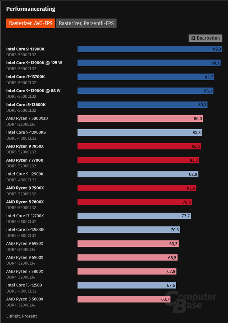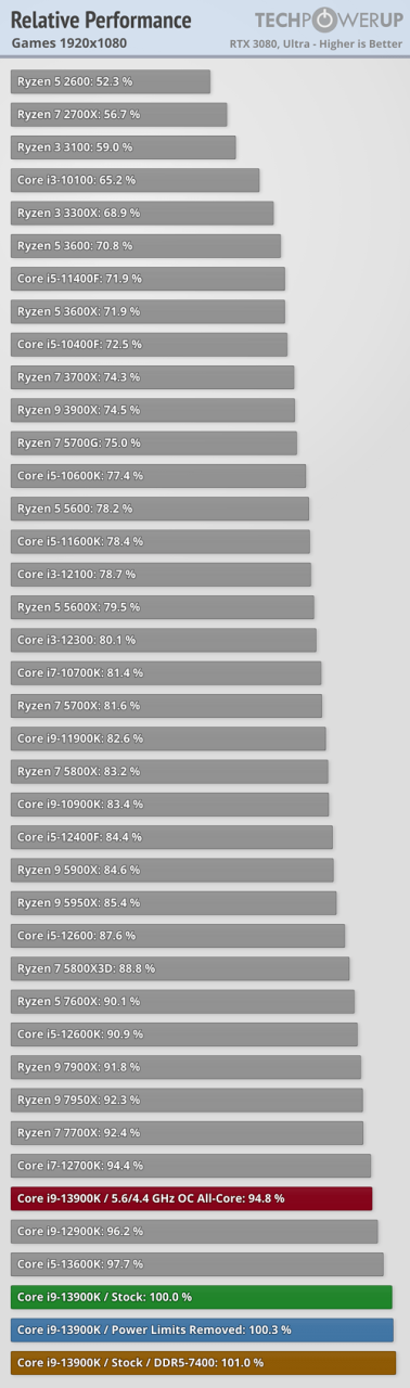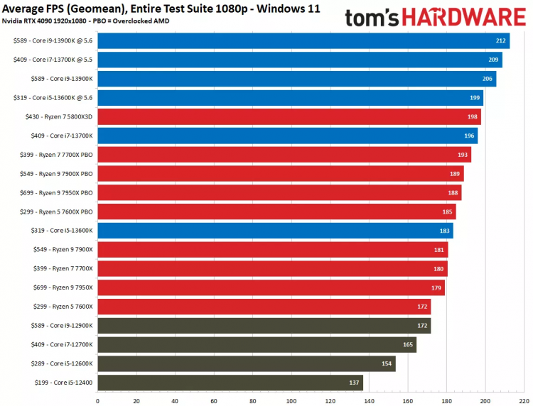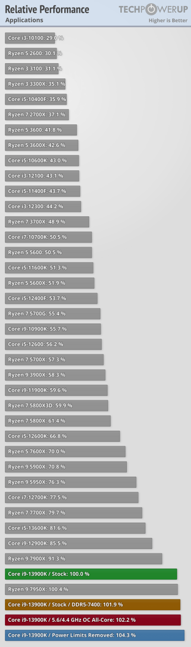 Como resultado, em jogos, o Core i9-13900K é cerca de 10-15% mais rápido que o Ryzen 9 7950X e 5-10% mais rápido que o Ryzen 7 5800X3D.