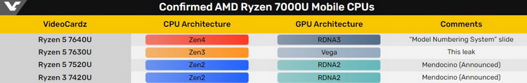 Até o momento, de uma forma ou de outra, foi confirmada a existência de pelo menos quatro processadores Ryzen 7000U energeticamente eficientes com TDPs de 15 a 28 watts. Estes são modelos Ryzen 5 usando três arquiteturas diferentes. Abaixo está uma tabela com os modelos especificados.
