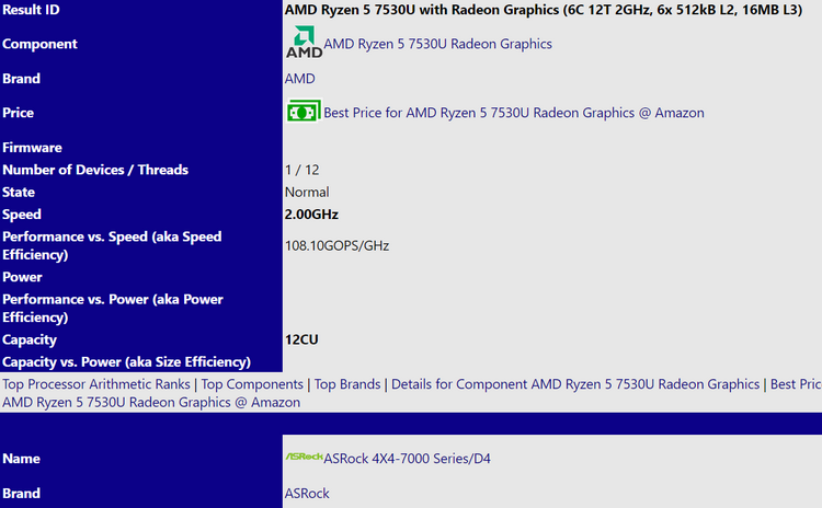 Recentemente, um processador de seis núcleos Ryzen 5 7530U não anunciado apareceu no banco de dados de teste sintético da SiSoftware. O chip foi testado em um PC compacto ASRock Mini-PC 4×4. Os dados indicam que o processador usa a arquitetura Zen de terceira geração. O chip tem 16 MB de cache L3 e 512 KB de cache L2 por núcleo.