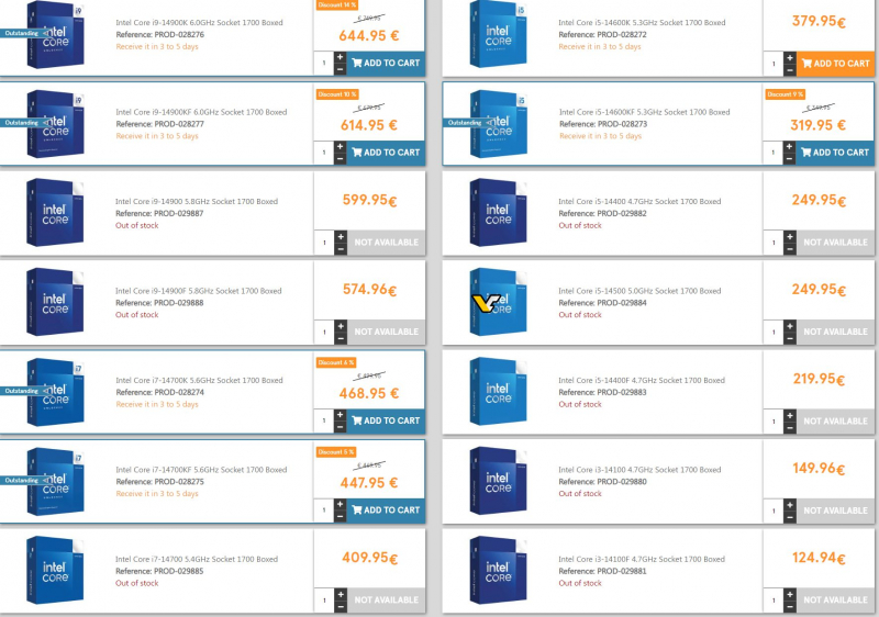 De acordo com o varejista espanhol Coolmod, o custo do Core i9-14900 será 7% menor que o da versão Core i9-14900K com multiplicador desbloqueado. Os chips Core i9-14900F e 14900KF sem gráficos integrados terão uma faixa de preço semelhante. A diferença de custo mais significativa é esperada entre o Core i7-14700 e o Core i7-14700K. Um modelo sem o sufixo “K” é estimado pelo vendedor como 13–14% mais barato.