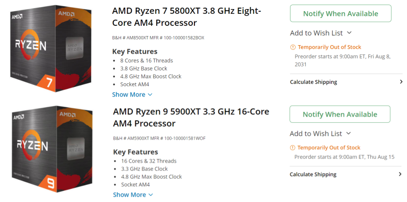 Na Computex 2024, no início de junho, a AMD revelou quatro processadores de desktop da série Ryzen 9000 baseados na arquitetura Zen 5 mais recente, bem como dois modelos da série Ryzen 5000XT baseados na arquitetura Zen 3 mais antiga. venda em 31 de julho. No entanto, a AMD atrasou oficialmente o lançamento dos modelos Zen 5 em até duas semanas. Por sua vez, nada se sabe oficialmente sobre o início das vendas do Ryzen 7 5800XT e Ryzen 9 5900XT.