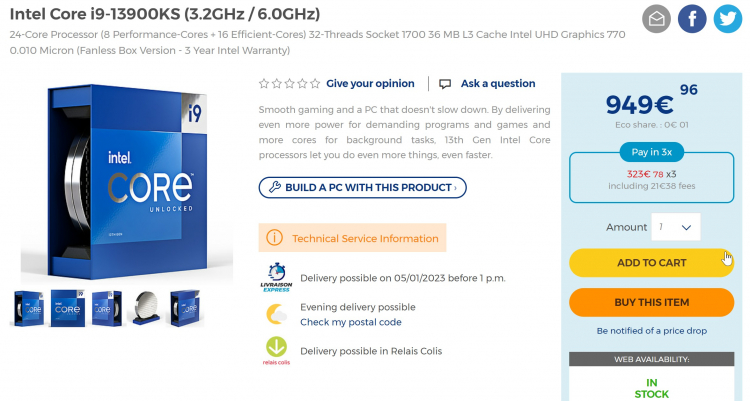 O processador também apareceu em um dos varejistas franceses, que o preço de € 949,96, que é € 180 mais caro que o Core i9-13900K na mesma loja.