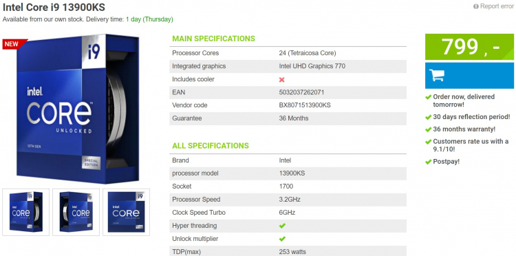 De acordo com os últimos rumores, o Core i9-13900KS estará à venda em 12 de janeiro. No entanto, a loja holandesa disse que já tem os chips em estoque e está pronta para enviá-los aos clientes amanhã. Logo após a novidade chamar muita atenção, a página com ela sumiu do site da vendedora holandesa.