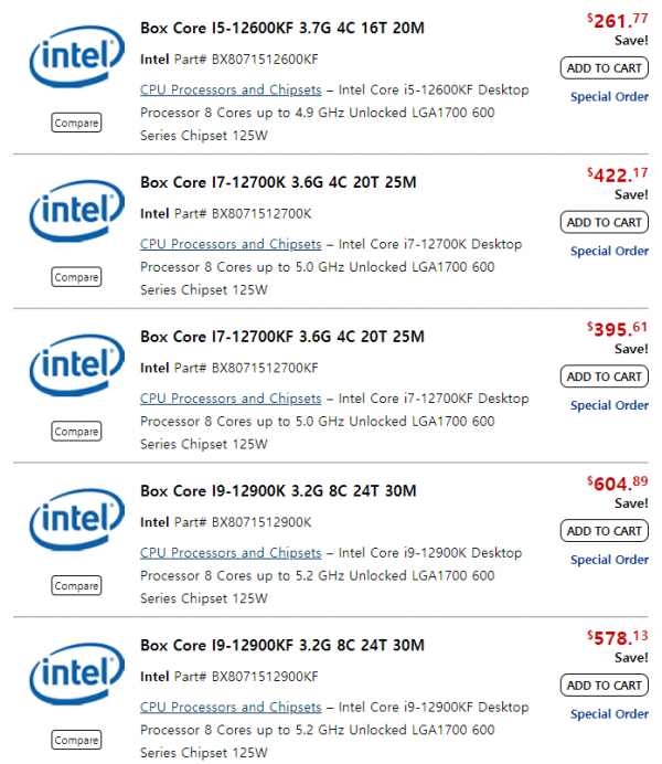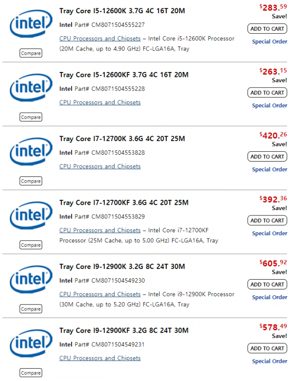 No banco de dados da loja Provantage, os preços foram encontrados para as versões em caixa e OEM dos processadores Core i9-12900K, Core i7-12700K e Core i5-12600K com um multiplicador desbloqueado, bem como suas versões KF, sem um núcleo gráfico integrado . Os chips da série KF custam US $ 26-27 menos do que os modelos convencionais.