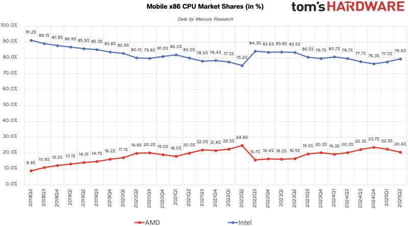 Em termos de receita, a participação de mercado da AMD em processadores móveis no segundo trimestre de 2025 foi de 21,5%, queda de 0,7% em relação ao primeiro trimestre, mas aumento de 3,9% em relação ao ano anterior. Isso mostra que a AMD está vendendo mais processadores para notebooks de médio e alto padrão em comparação com o ano passado, apesar da queda nos volumes. A receita da Intel caiu na mesma proporção que o crescimento da AMD. Apesar de manter a maior fatia do mercado, a Intel está perdendo terreno nos segmentos de ponta do mercado móvel, onde as ofertas da AMD parecem mais competitivas.