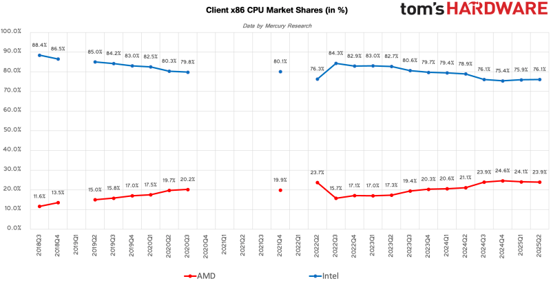 A participação da AMD nas vendas totais de processadores para o consumidor no segundo trimestre de 2025 foi de 23,9%, queda de 0,2% em relação ao trimestre anterior, mas alta de 2,8% em relação ao ano anterior. No entanto, em comparação com o terceiro e o quarto trimestres de 2024, a participação da AMD neste segmento parece estar estagnada.